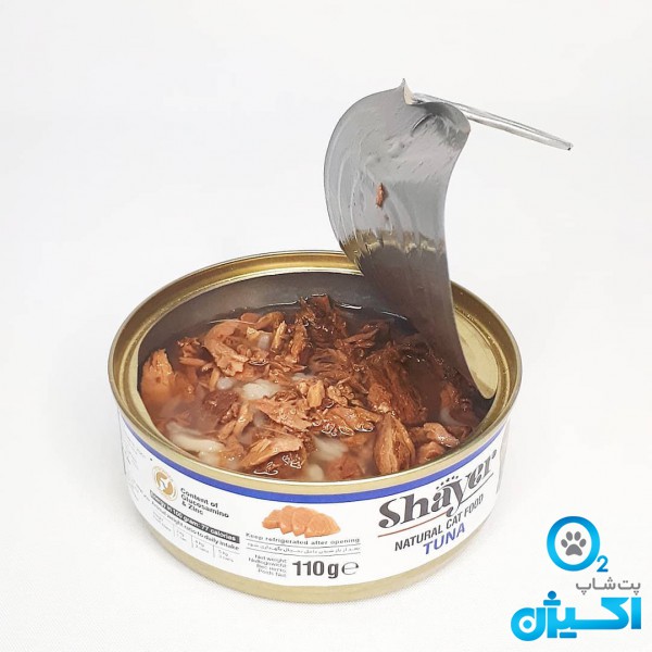 کنسرو گربه “شایر” با طعم ماهی تن “۱۰۰% نچرال” شامل تکههای طبیعی ماهی تن و کمی برنج است.
