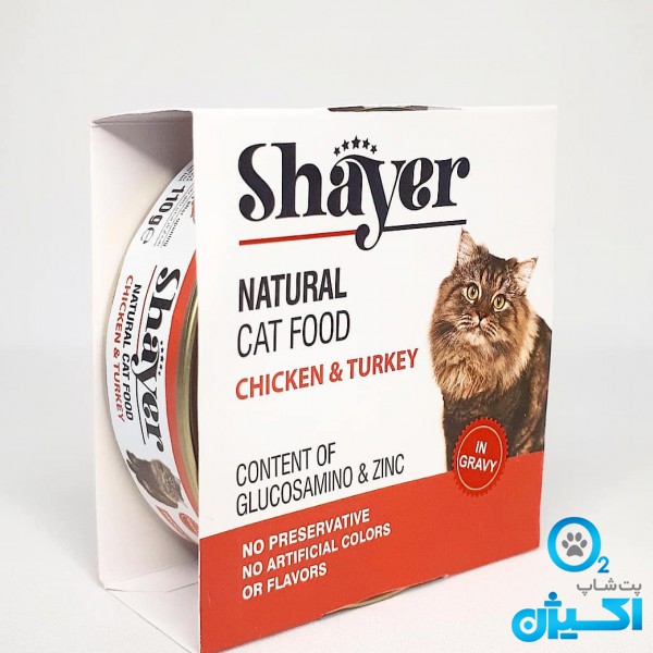 کنسرو گربه “شایر” با طعم مرغ و بوقلمون حاوی گوشت مرغ و بوقلمون همراه با جگر، کمی برنج، هویج، نخود سبز،کلم و استخوان میباشد.